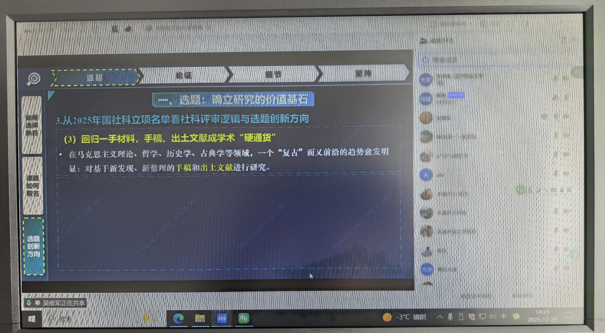 吴维军老师讲座的题目是《社科基金立项的实践与思考》。讲座分为4个部分:选题—确立研究的价值基石;论证—构建严谨的学术蓝图;细节—成就品质的关键雕琢;坚持—通往成功的必由之路。整场讲座既有理论高度,又有实践深度,更充满治学温度。讲座不仅系统阐述了社科基金项目选题、论证、撰写等方面的具体方法,更以亲身经历展现了辽宁开大人“板凳甘坐十年冷”的学术坚守和“日拱一卒,功不唐捐”的科研精神。